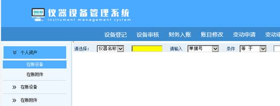 1.如需要变更调整资产领用人,资产管理员可点击“变动申请”中“院处转出入申请”下的“领用人调整”菜单项,并在右侧搜索框内输入“仪器编号”等查询条件搜出需要调整领用人的资产